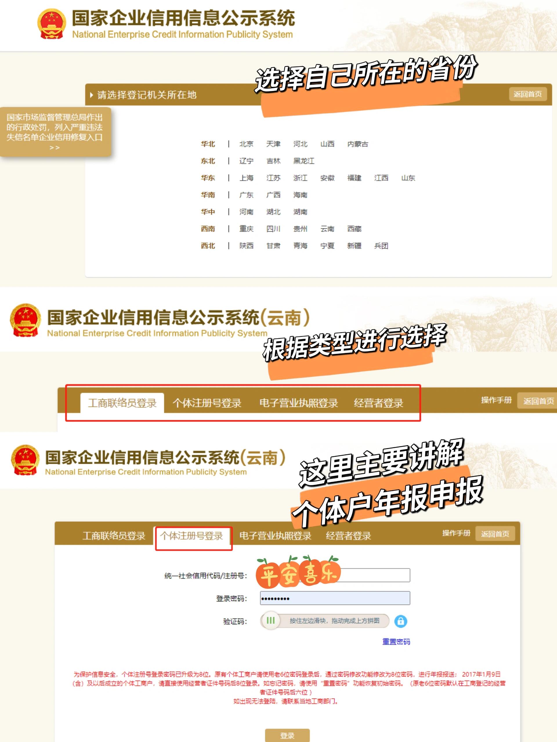 登錄頁(yè)面后,找到企業(yè)信息年報(bào),然后選地區(qū),你的執(zhí)照是哪個(gè)省的,就選哪個(gè)省份,這個(gè)別選混了!