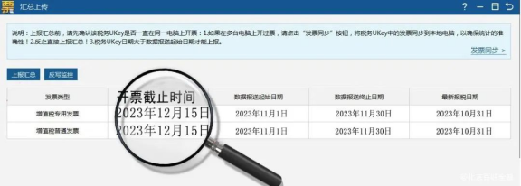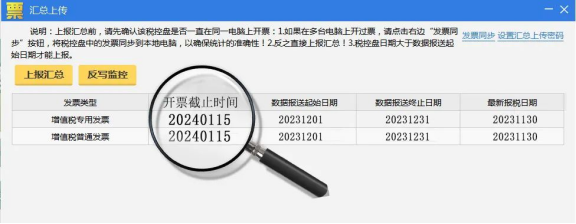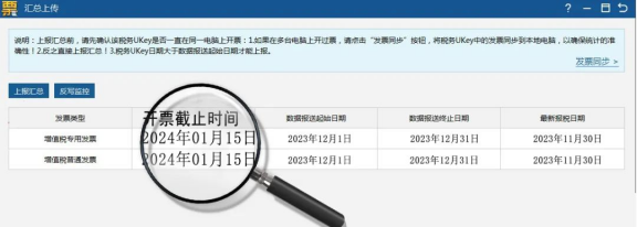 ●反寫監(jiān)控:申報成功后,點擊【數(shù)據(jù)管理】-【匯總上傳】-【反寫監(jiān)控】,開票截止時間更新到2024年1月15日表示成功。