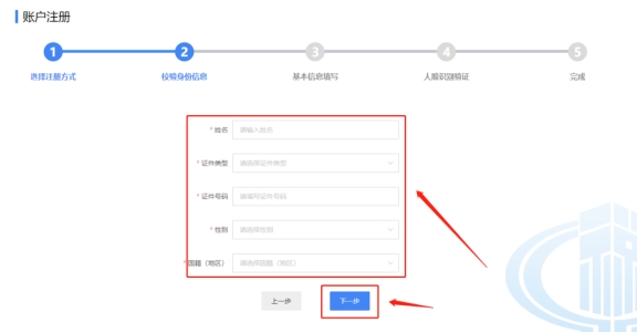 三、在校驗(yàn)身份信息頁(yè)面填寫(xiě)姓名、證件類型、證件號(hào)碼、性別、國(guó)籍(地區(qū)), 點(diǎn)擊下一步,拖動(dòng)滑塊驗(yàn)證。