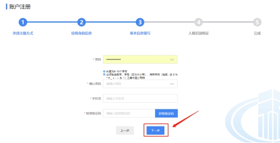 四、基本信息填寫(xiě)可自行設(shè)置密碼,密碼設(shè)置要求長(zhǎng)度為8-16個(gè)字符且必須包含數(shù)字、字母(區(qū)分大小寫(xiě))、特殊字符(包括.@$% *#_+-&^)三者中至少兩種,填寫(xiě)手機(jī)號(hào),點(diǎn)擊“獲取驗(yàn)證碼”。查收手機(jī)短信,填寫(xiě)短信驗(yàn)證碼,點(diǎn)擊下一步;進(jìn)行人臉識(shí)別驗(yàn)證。