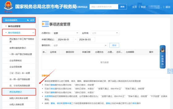 二、綜合信息報告—身份信息報告 — 跨區(qū)稅源登記,進入后點擊“02 查詢經(jīng)營項目地址及稅率”,在需要刪除的項目地址后方操作下方點擊【刪除】即可。