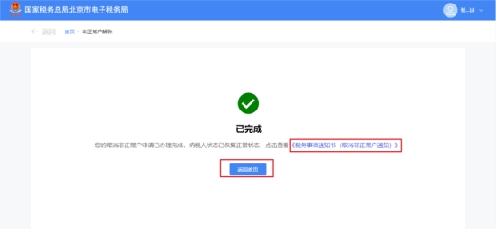 納稅人不存在未辦結(jié)事項(xiàng)。系統(tǒng)直接跳轉(zhuǎn)至取消非正常戶認(rèn)定辦理成功界面,點(diǎn)擊【《稅務(wù)事項(xiàng)通知書(取消非正常戶通知)》】可下載對(duì)應(yīng)文書。點(diǎn)擊【返回首頁】可返回系統(tǒng)首頁。