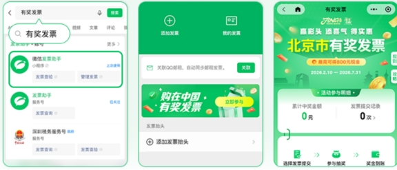 微信支付:搜「有獎發(fā)票」,點微信發(fā)票助手進入活動頁,手動選北京定位就行