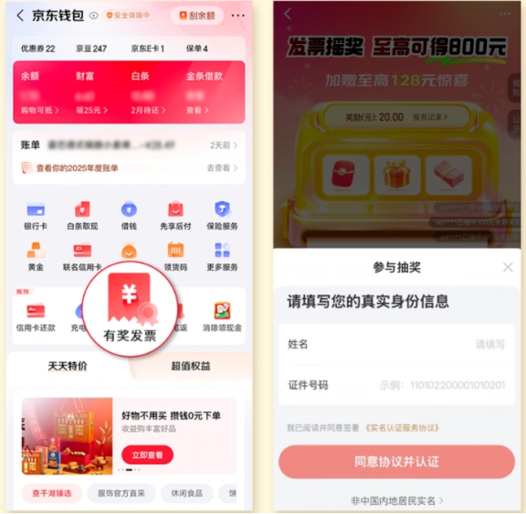 京東支付:打開京東APP點「我的」-「錢包」-「有獎發(fā)票」專區(qū),先完成實名認證再上傳發(fā)票