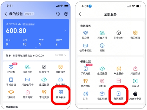 抖音支付:搜「有獎發(fā)票」「樂購新春」「發(fā)票抽獎」任意一個關(guān)鍵詞就能進活動主會場,或者點「我」-「錢包」-「更多服務(wù)」-「有獎發(fā)票」,按要求上傳就ok